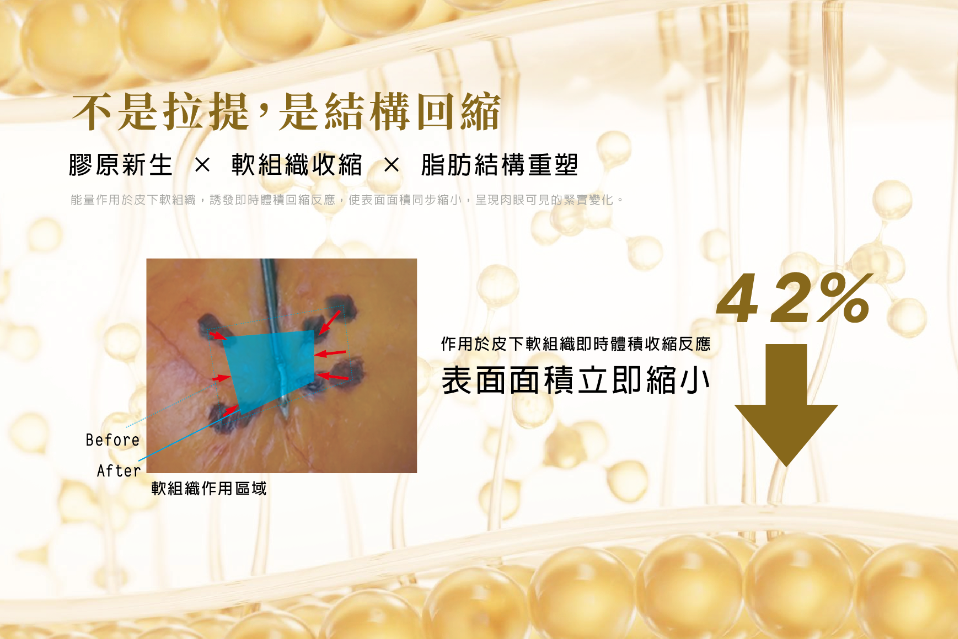 當皮下組織的溫度上升至50°C~70°C時脂肪細胞會發生液化並促使FSN(纖維中隔網)收縮立即感受緊實同時熱能刺激會長期誘導纖維細胞分泌大量膠原蛋白增生