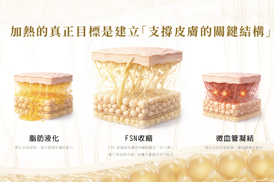 許多鬆垂與輪廓變化的來源,不只是皮膚表面細紋,而是更深層的脂肪墊、纖維中隔與筋膜支撐逐漸鬆動,導致皮膚與軟組織整體向下位移。結構型緊實的概念,是針對這些深層支撐結構給予適度熱能與收縮刺激,幫助鬆弛的組織回到較緊實、較穩定的狀態,而不僅僅是拉平表層紋路。