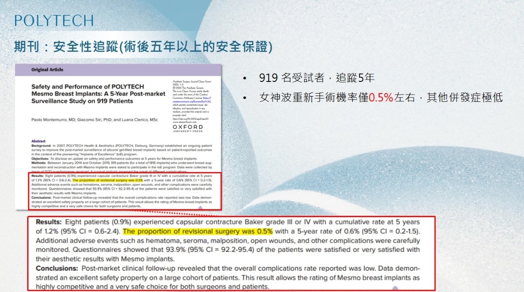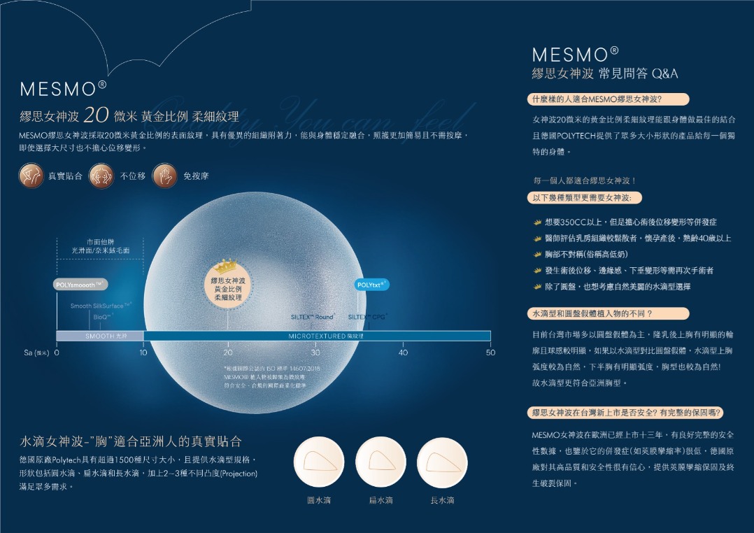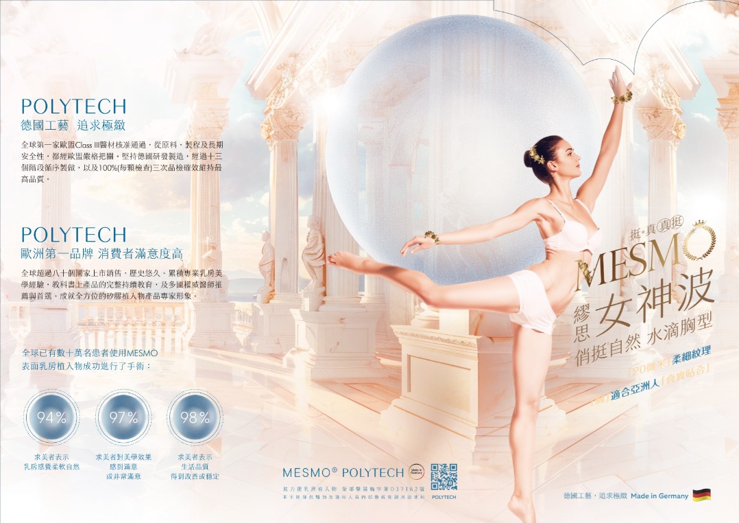 MESMO®繆思女神波是由德國38年經驗唯一矽膠植入物品牌POLYTECH所生產的填充果凍矽膠假體,已經銷售至80個國家以上,目前已累積銷售超過300萬個植入物,並提供超過2,000種乳房植入物款式,繆思女神波經過黃金比例設計與13道嚴謹檢驗程序,一顆假體需耗時4周才能完成,皆須經過3次人工品管檢查才能出廠。