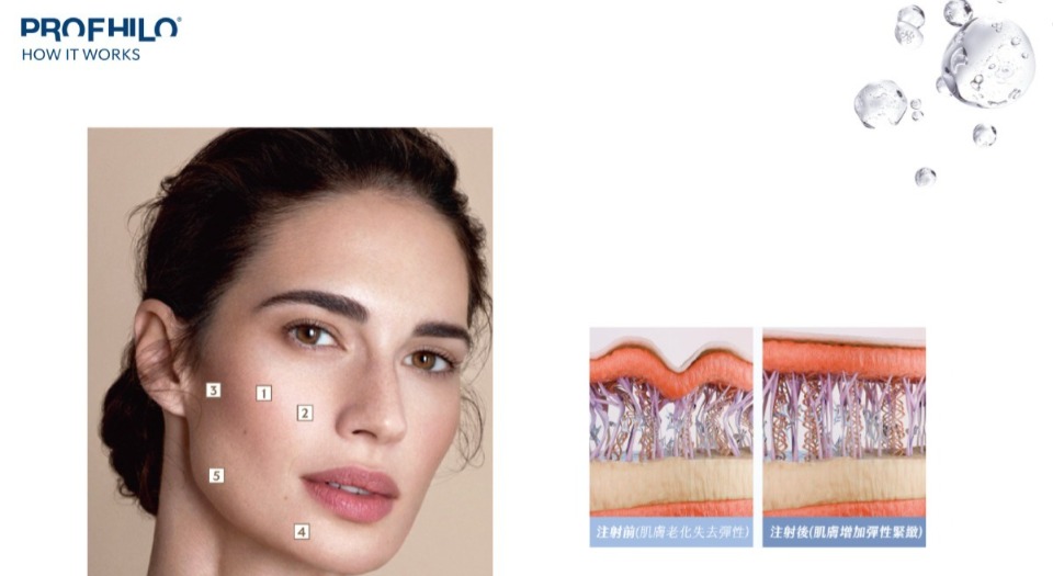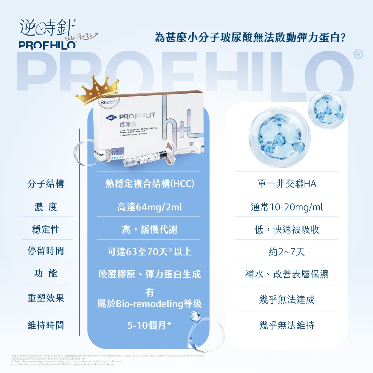 PROFHILO逆時針®︎是一種可注射的全新產品,以NAHYCO®︎專利技術製成,可以活化細胞生產彈力蛋白機制,效果穩定自然。與市面各種皮膚植入劑不同,PROFHILO®︎易於流動,能均勻分布於肌膚,不會導致局部注射引起的不自然腫脹感,使肌膚更彈性緊實,更自然。