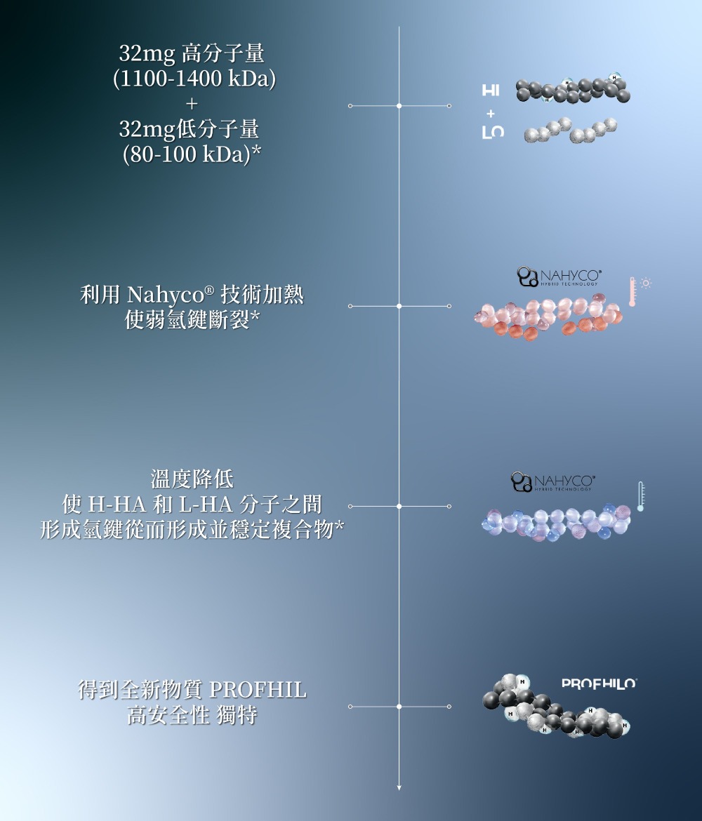 PROFHILO 的核心是其獨特的 NAHYCO® 專利技術。這項技術將高分子量玻尿酸 (H-HA) 和低分子量玻尿酸 (L-HA) 結合,形成穩定的「混合協同複合體」(Hybrid Cooperative Complexes, HCC)。 具有「流動力、滲透力、無交聯」三大特性。